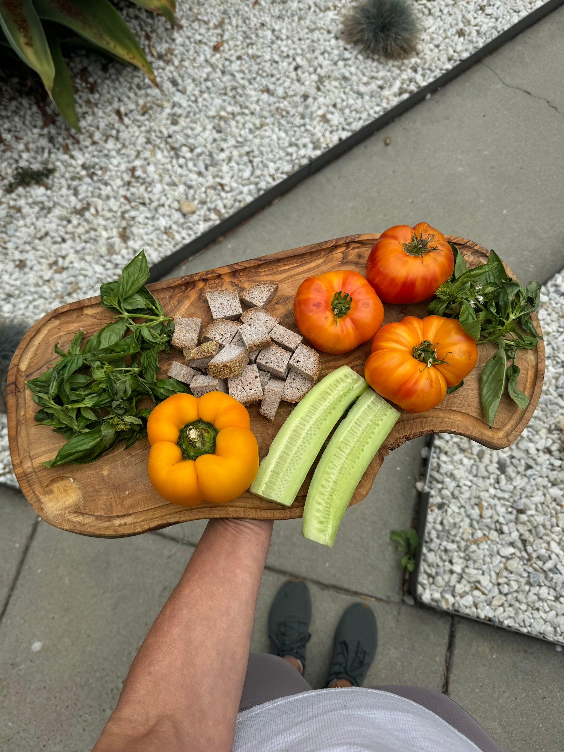 If you’re looking for a gluten-free summer salad that brings all the freshness and vibrancy of a Tuscan garden, then you have come to the right place. This gorgeous panzanella salad recipe, made with bread from our keto-friendly baked goods collection, will leave the flavors of the sunny season lingering on your tongue in a delightful way. If this particular dish is not something you have much experience with, don’t worry. The recipe is quite easy. Actually, panzanella is a rather old recipe, boasting origins from the 14th century. Farmers in Tuscany, keen on eliminating waste, would combine their stale bread with vegetables, oil, and herbs, soaking the hard bread to give it a chewy texture. Over time, different regions of Italy added to this simple fare, each location developing their own spin on this traditional meal. Generally however, panzanella will use bread, onion, and tomatoes—although this is a more “recent” addition since tomatoes were not popularized in Italy until around the 18th century. This is one of those recipes that’s great to explore with varying ingredients, so while we are providing you with a lovely way to partake in this dish, know you can always add or substitute! For instance, to keep things dairy-free, I used onions, pepper, and cucumbers in my salad for a singularly refreshing experience!